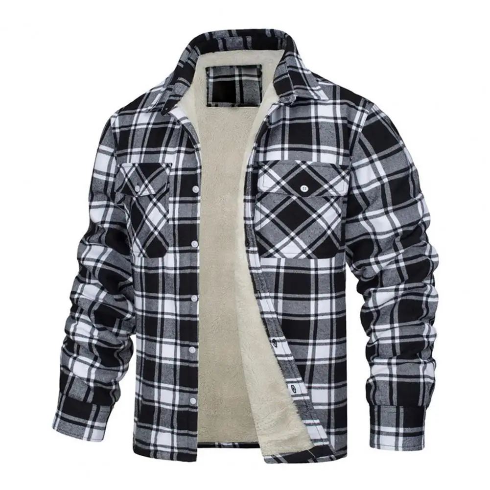 Men Fall Winter Jacket Plaid Print Lapel Soft Plush Pockets Single-breasted Loose Thickened Long Sleeve Casual Mid Length Men Coat